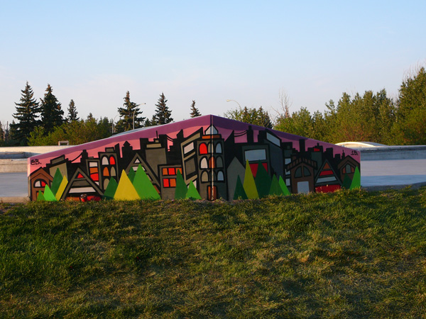 Evan Brunt is a talented industrial artist who completed two art murals at the Fulton Ravine South skate park. In the past he has done a number of art murals as private commissions in the Edmonton area and in Vancouver. He has also worked on some larger murals in collaboration with other artists. Evan puts a lot of thought into considering the needs of the client and the unique features of each site when he develops his art concepts.